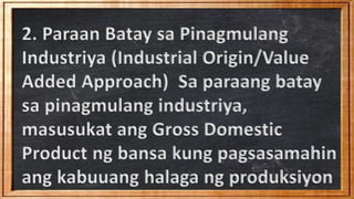 2 pamamaraan batay sa kita ng sangkap ng produksiyon income approach at 3 pamamaraan batay sa pinagmulang industriya industrial origin approach. Ang GNI ay sinusukat gamit ang salapi ng isang bansa. Paraan Batay sa Pinagmulang Industriya Industrial Origin Value Added Approach from SHS 12 at Malate Catholic School.