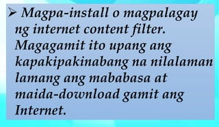 Tamang sagot sa tanong. Ano ang tamang pamamaraan sa paggamit ng computer. Magpa-install o magpalagay ng internet content filter.