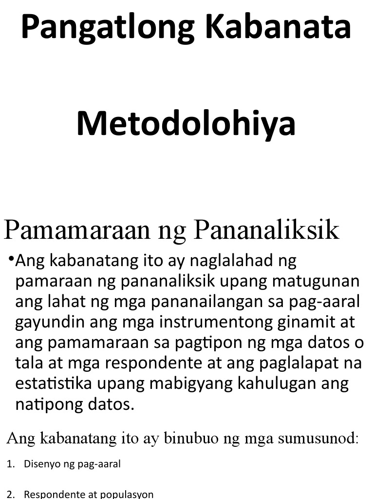 Napili ang pamamaarang ito dahil makatugon ito sa pagtukoy sa kung mahusay ang programang may malaking kinalaman sa Filipino sa bawat unibersidad sa pamamagitan ng paglalarawan sa kasalukuyang gagamit sa kurikulum nito. Report an issue. Kailangang maging katanggap-tanggap ang mga pamamaraang ginamit sa pananaliksik maging ang mga datos na nakalap.