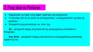 Kay o Kina ginagamit kapag ang kasunod ay pangngalang pantangi na pangalan ng isang tao. Ito ay nagsasaad ng lugar kung. Ang mga salita ay halimbawa ng _____.
