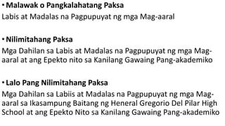 Start studying Filipino sa Piling Larangan - 02 Mga Uri ng Pagsusulat. Ang layunin ng pananaliksik na ito ay magpaliwanag Ang pananaliksik na ito ay binubuo ng teorya o paliwanag tungkol sa isang penomenon pangyayari At ito ay deskriptibo o naglalarawan. Makakatulong din ang resulta nito para makapagbigay pa ng karagdagang impormasyon sa isang kaalamang umiiral na sa kasalukuyan.
