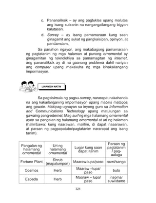 Pangalan ng Halamang Ornamental Uri ng Halamang Ornamental Lugar Kung Saan dapat itanim Paraan sa pagtatanim Pagaalaga SAN FRANCISCO HERB LUPAMAARAW SANGA ROSAS PALUMPONG LUPAMALAMIG MAARAW BUTO FIVE FINGER VINE PASOLUPA SANGA SAMPAGUITA PALUMPONG PASOKAHOY SANGA DAMA. 2 Aralin 1 Pagpili ng Halamang Ornamental Bahagi na ng ating kapaligiran ang pagkakaroon ng iba-ibang uri ng mga halaman. Sa isang magsasaka ang pagtatanim ay isang gawaing maipagmamalaki lalo na kapag maunlad ang ani.