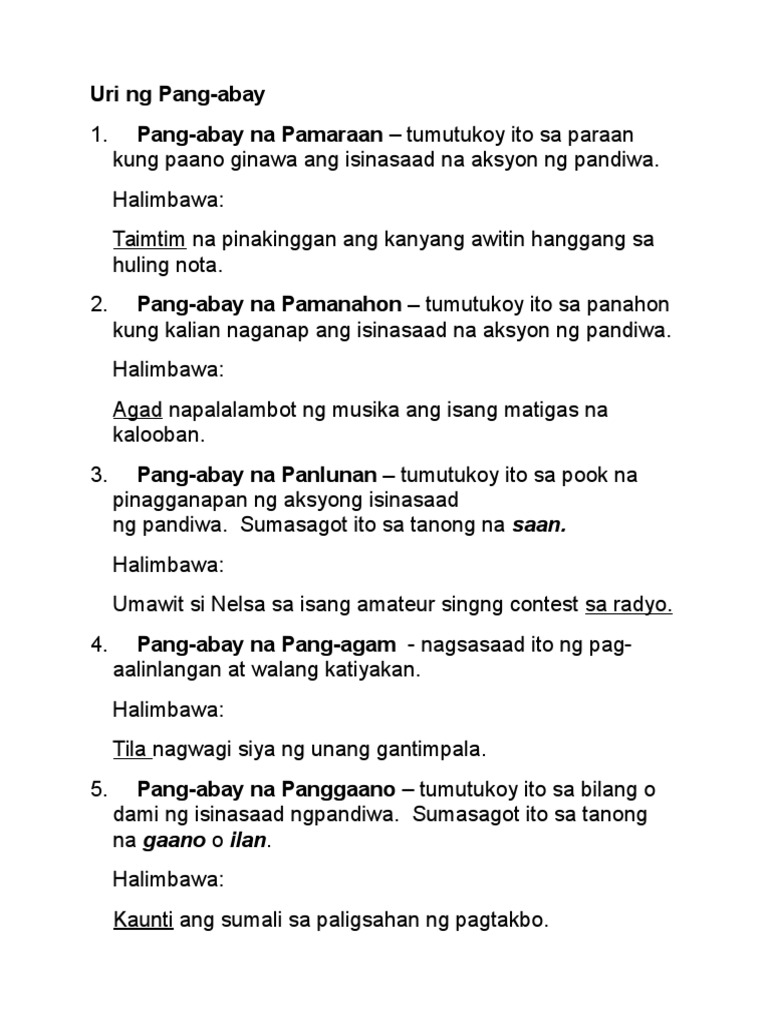 Halimbawa Ng Pang Abay Na Pamaraan Panlunan At Pamanahon