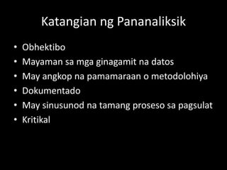 Paglararawan Descriptive Method B. Hindi pa ito ang pinal sapagkat maaari ka pang magdagdag o magbawas ng sanggunian. - nararapat pinag-isipang mabuti at dumaan sa isang maingat na pagsusuri upang matiyak na.