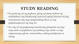 Maging sa pagbabasa ay may dalawang uri tayong pinag-aaralan. Ang Proseso ng Pagbasa Ang pagbasa ay isang proseso ng pagbibigay-kahulugan ng mga simbolo at salita. Kahalagahan ng pagbasa 1.