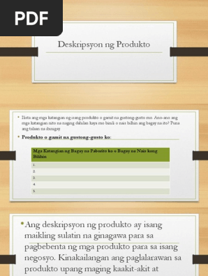 Trabaho sa magkabilang grupo. MGA PARAAN SA PAGSULAT NG DESKRIPSIYON NG PRODUKTO 10Gumamit ng pormat na madaling i-scan. Pambansang nabibili ang produkto nationwide tulad ng mga napapanood sa telebisyon.