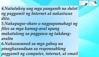 1we should be the only ones who know tje password. Tiyakinitakda kung aling websites ang maaaring bisitahin at kung gaano katagal maaaring gumamit ng kompyuter internet at email. Kasiya- siyang Gawain ang paggamit ng computer internet at email.