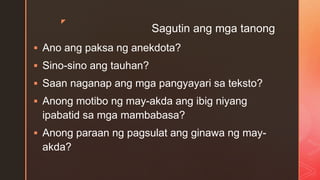 Paksa tauhan tagpuan motibo ng awtor paraan ng pagsulat at iba pa. Nahihinuha ang damdamin ng sumulat sa napakinggang anekdota F10PN-IIIb-77 2. Ito ay dapat bigyang kahulugan sa pagsulat ng anekdota.