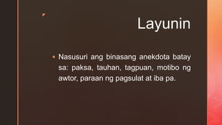 Layunin Nasusuri ang binasang anekdota batay sa.