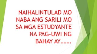 Ang magagandang mag-aaral ay may kakayahang gawin ang lahat sa kanilang pag-aaral hindi lamang batay sa plano ng aralin na ibinigay sa kanila ng mga guro kundi pati na rin ang paggawa ng malawak na pananaliksik sa online at sa pamamagitan ng ibat ibang inirekumendang teksto upang makakuha ng mas malawak na pag-unawa sa ibat ibang mga konsepto at pag-unawa. 2pag-gawa ng mga gawaing bahay ng hindi inuutusanmag-walis mag-punas ng sahig 3wag i-utos sa kapatid kung kaya namang gawin. 4Bilang mag-aaral kailangan mo tumulong kung kina-kailangan.